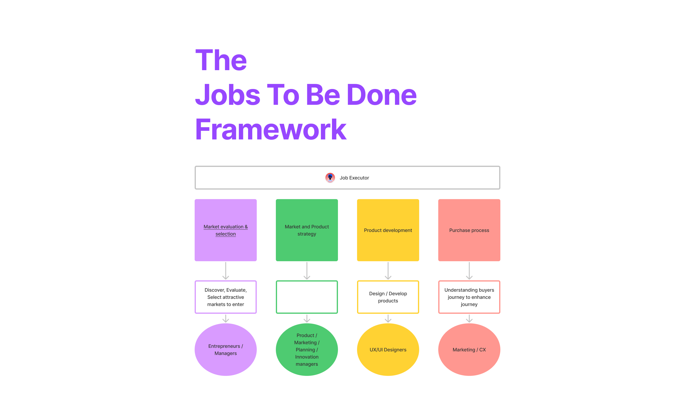 A diagram of collection of ideas for product thinking. Mostly an amalgamation of teaching on JTBD framework by Anthony W. Ulwick and Clayton Christensen