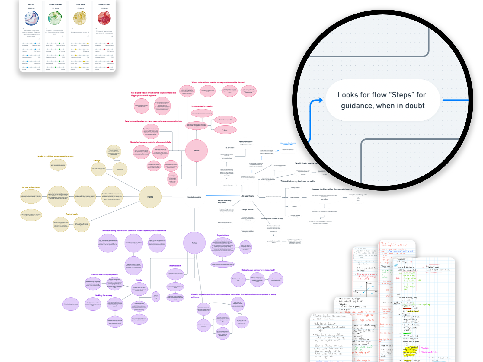 Top-Left: Personas • Center: Mental models • Botton-right: User testing notes